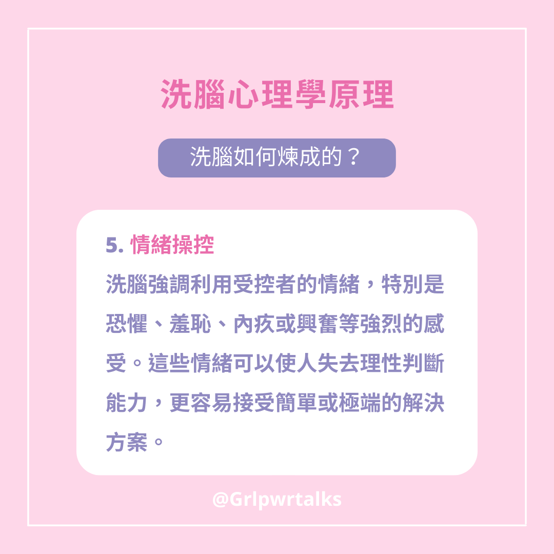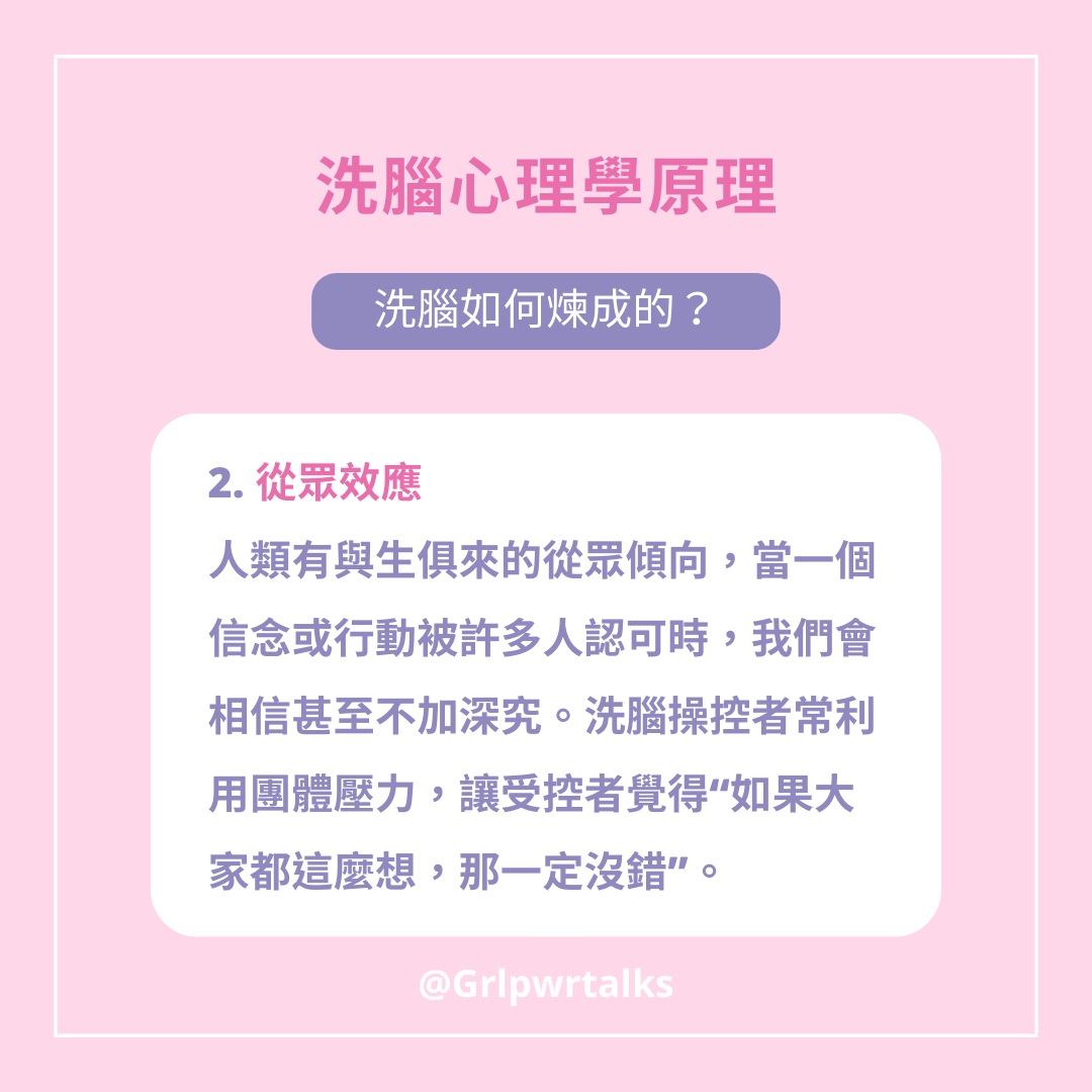 如同神洗腦之所以有效,是因為它利用了心理學中的幾個核心概念,例如從眾效應、重複暴露效應和權威效應等,並透過人們的情緒弱點來改變他們的信念和行為。