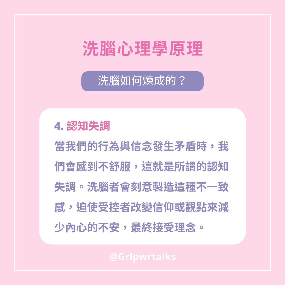 當我們的行為與信念發生矛盾時,我們會感到不舒服,這就是所謂的認知失調。洗腦者會刻意製造這種不一致感,迫使受控者改變信仰或觀點來減少內心的不安,最終接受被灌輸的理念。