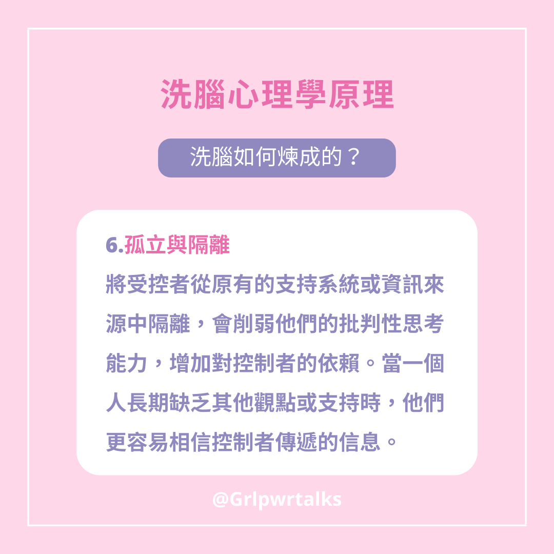 將受控者從原有的支持系統或資訊來源中隔離,會削弱他們的批判性思考能力,增加對控制者的依賴。當一個人長期缺乏其他觀點或支持時,他們更容易相信控制者傳遞的信息。