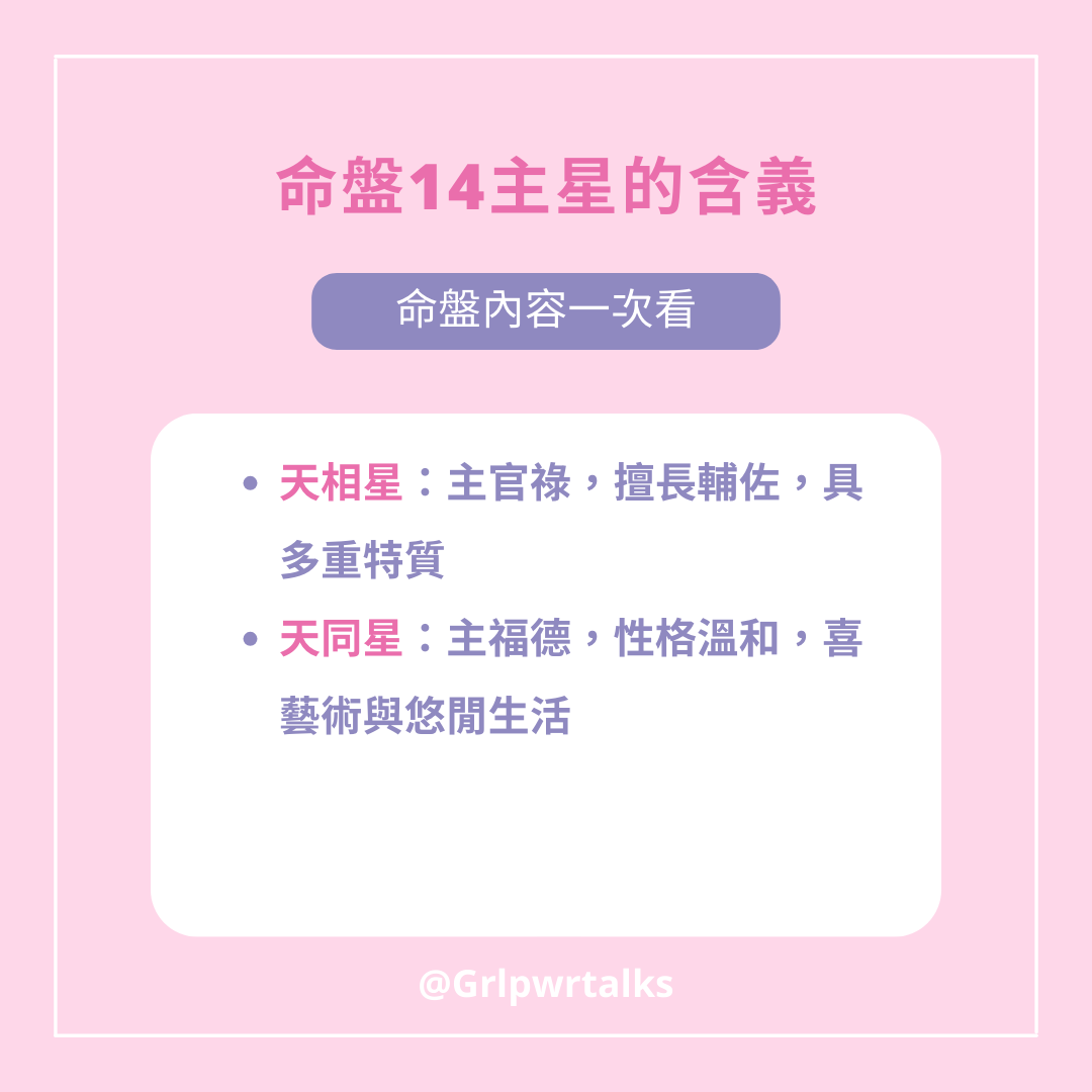 - 天同星:主福德,性格溫和,喜藝術與悠閒生活