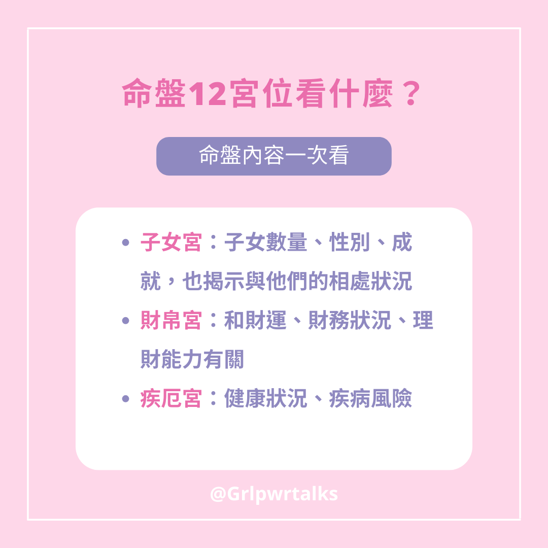 - 子女宮:子女數量、性別、成就,也揭示與他們的相處狀況
