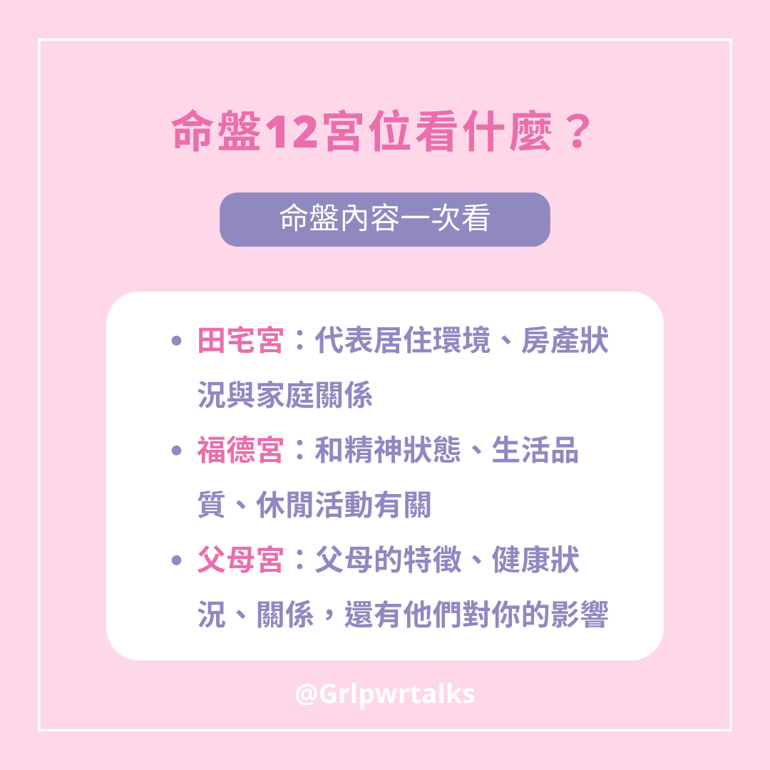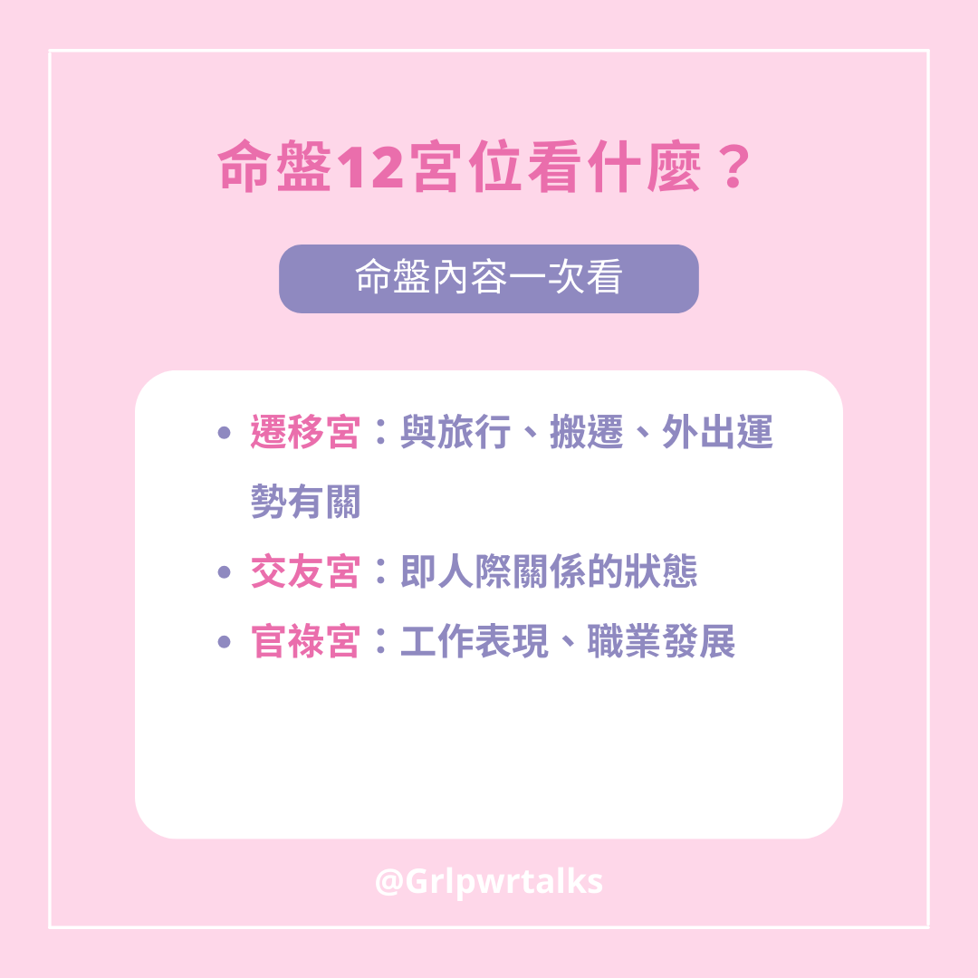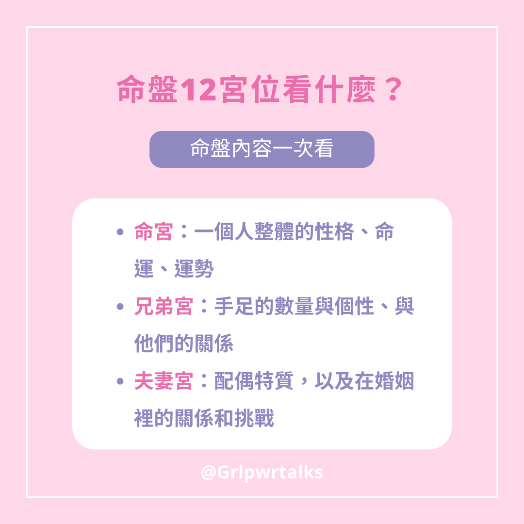 - 夫妻宮:配偶特質,以及在婚姻裡的關係和挑戰