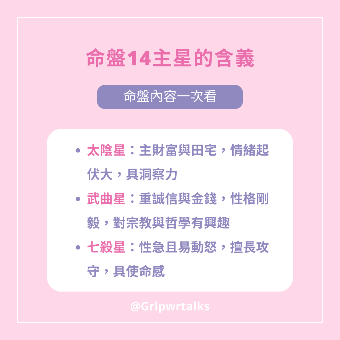 - 太陰星:主財富與田宅,情緒起伏大,具洞察力