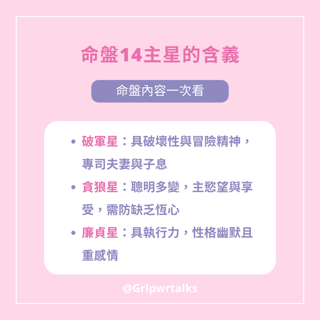 - 破軍星:具破壞性與冒險精神,專司夫妻與子息