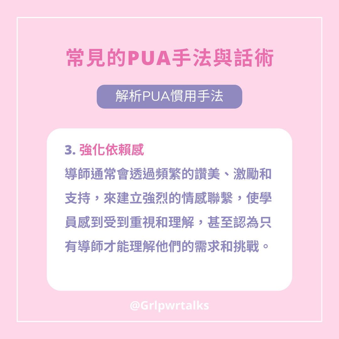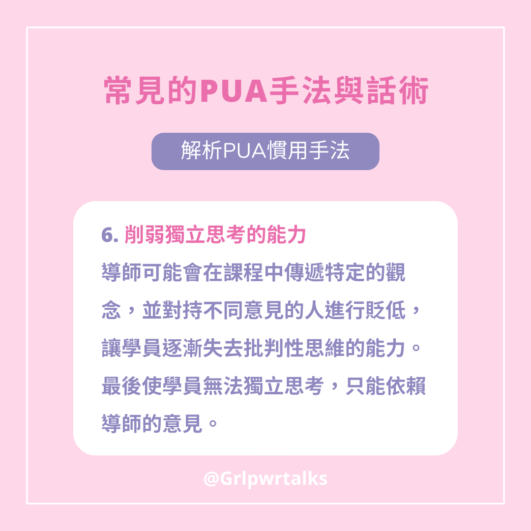 PUA 精神控制會深深影響一個人的心理健康,尤其當它出現在心靈課程中更需警惕。了解這些手法和話術,判斷自己是否被PUA,並學會擺脫控制,能讓我們避免過度依賴他人,重視自身的心靈健康。在成長的路上,請記得保持清醒與理性,不論外界的聲音多強烈,唯有你自己的選擇才是最重要的。